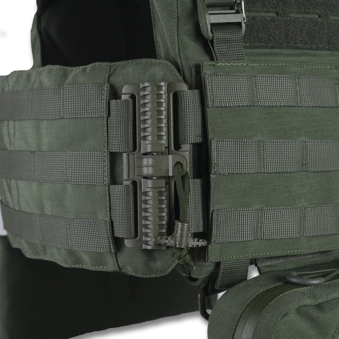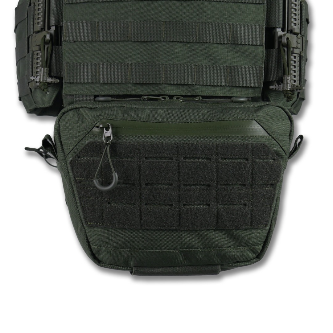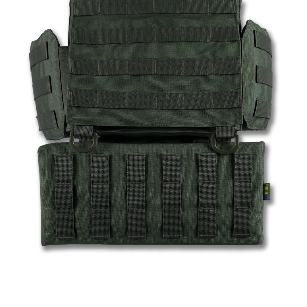 Передня панель: з’ємна, кріпиться на Velcro та карабіни Woojin. Оснащена системою Molle для розміщення 3 підсумків або іншого спорядження. Можливість швидкої заміни панелі на іншу з підготовленим спорядженням.