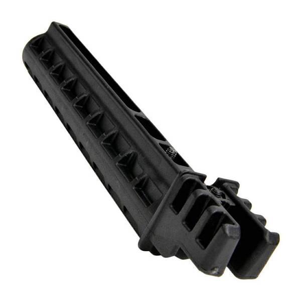 Адаптер телескопічного приклада являє собою “вилку”, яку розклинює композитна трапецієподібна вкладка, що підтягується вгору гвинтом.
