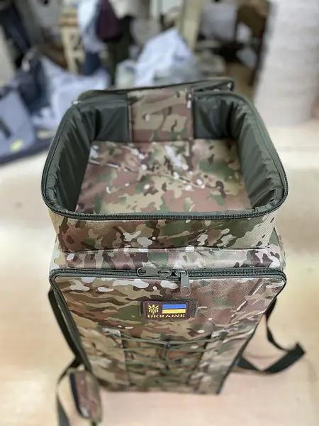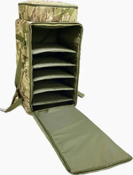 Тканина Cordura .В середину всіх частин сумки вшитий тонкий полікарарбонат який запобігає механічному пошкодженню вантажу.Основне відділення відкривається за принципом валізи та поділене на окремі секції для зручного розміщення семи дронів. Якщо зняти внутрішні відсіки, то сумка-рюкзак дозволяє вмістити 12 дронів без батарей. Зверху рюкзака передбачили спеціальнe відділення для додаткових пристроїв: пульта керування, акумуляторів, окулярів, кабелів тощо.З боку є кишеня з водонепроникною блискавкою яка зберігає речі від вологи. На фронтальній частині рюкзака є шнурівка з еластичної резинки з фіксатором, яка дає можливість переносити куртку, маскувальну сітку або інші подібні речі. Плечові лямки оснащені системою швидкого скидання. Додаткові ручки з обох боків дозволяють нести рюкзак як у горизонтальному, так і вертикальному положенні. Розміри: