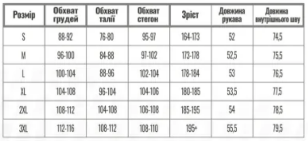 Розміри комплектів — S, M, L, XL, XXl, XXXL.